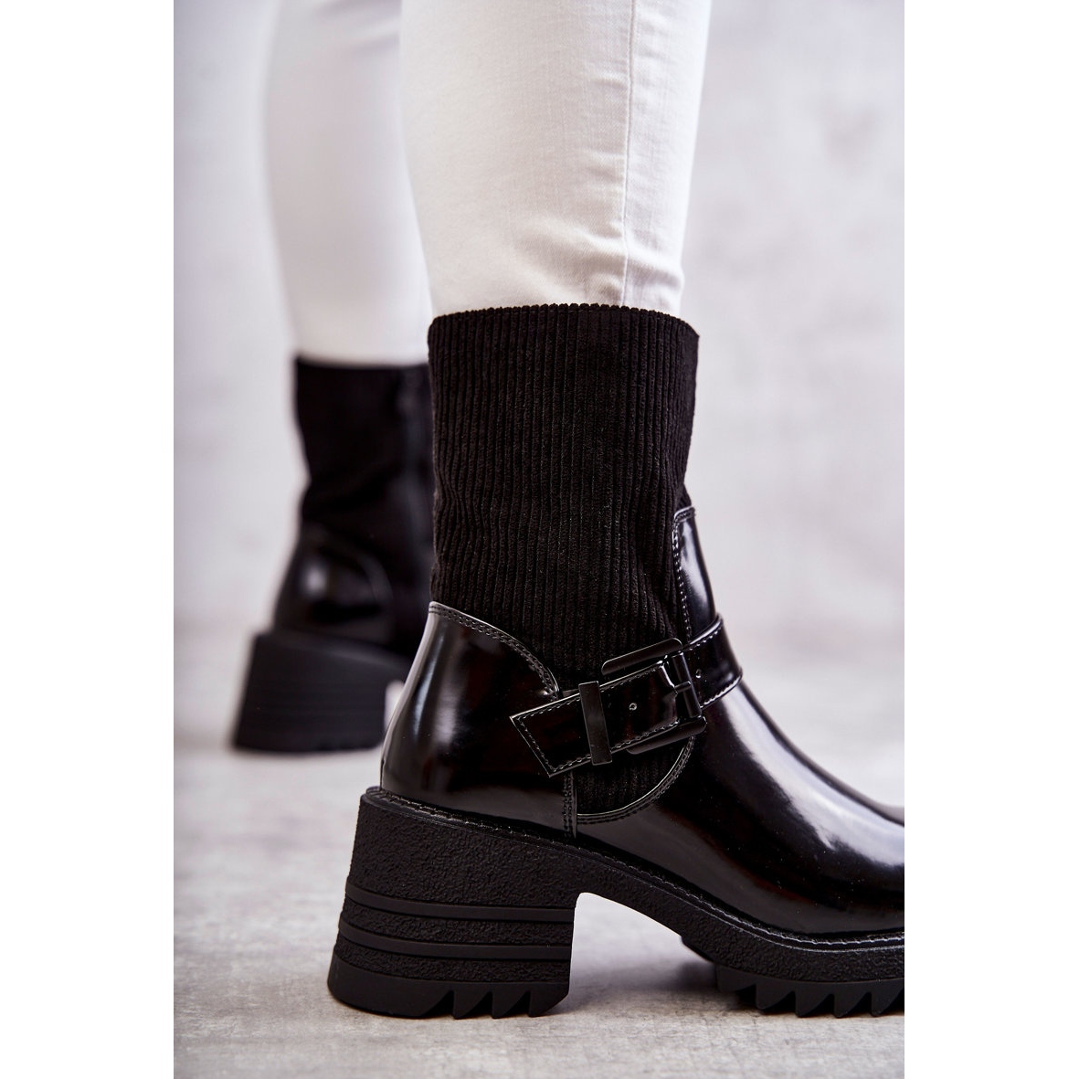 Elegantne i praktične čizme stvorene za hladnije dane. Kombinacija lakirane ekološke kože s materijalom koji nalikuje corduroys daje im moderan, pomalo stijenski karakter i izolaciju u obliku pokrivača obuće osigurava toplinsku udobnost. Ogroman potplat s nepravilnim gazom i stabilnom, 7 cm pete s platformom od 2,5 cm jamči udobnost i određeni korak, dok ukrasna kopča s podesivim pojasom dodaje stilski naglasak.