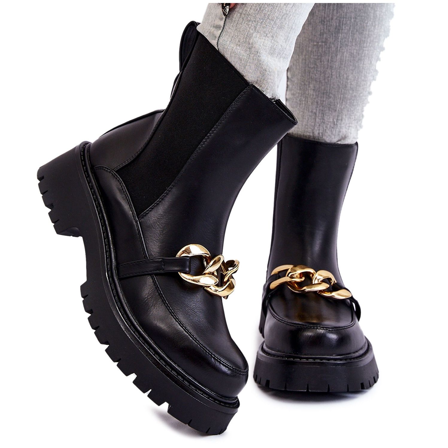 Jedan od najvažnijih elemenata ovog modela je impresivan lanac na prednjoj strani koji cijeloj kombinaciji daje originalan karakter. Čizme imaju ravnu potpeticu visine 5 cm i žljebaste potplate, što osigurava stabilnost i sigurnost pri hodu. Njihova minimalistička crna boja savršeno ih uklapa u različite stilove, kako za svakodnevnu upotrebu tako i za svečanije prigode.