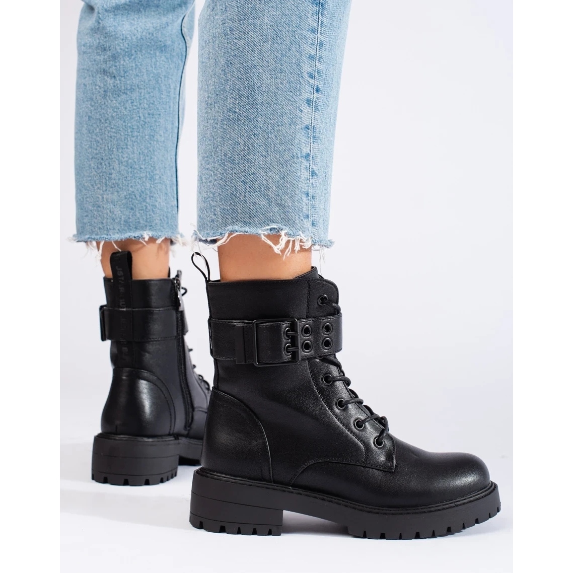 Moderan i praktični radnici koji će raditi u jesenskom i zimskom garderobi. Izrađene od visokokvalitetne ekološke kože, s zagrijavanjem i pokrivačem obuće u unutrašnjosti - oni osiguravaju toplinsku udobnost za svakodnevnu upotrebu. Klasični, rock lik naglašava se vezanjem i čvrstim potplatom s gazom.