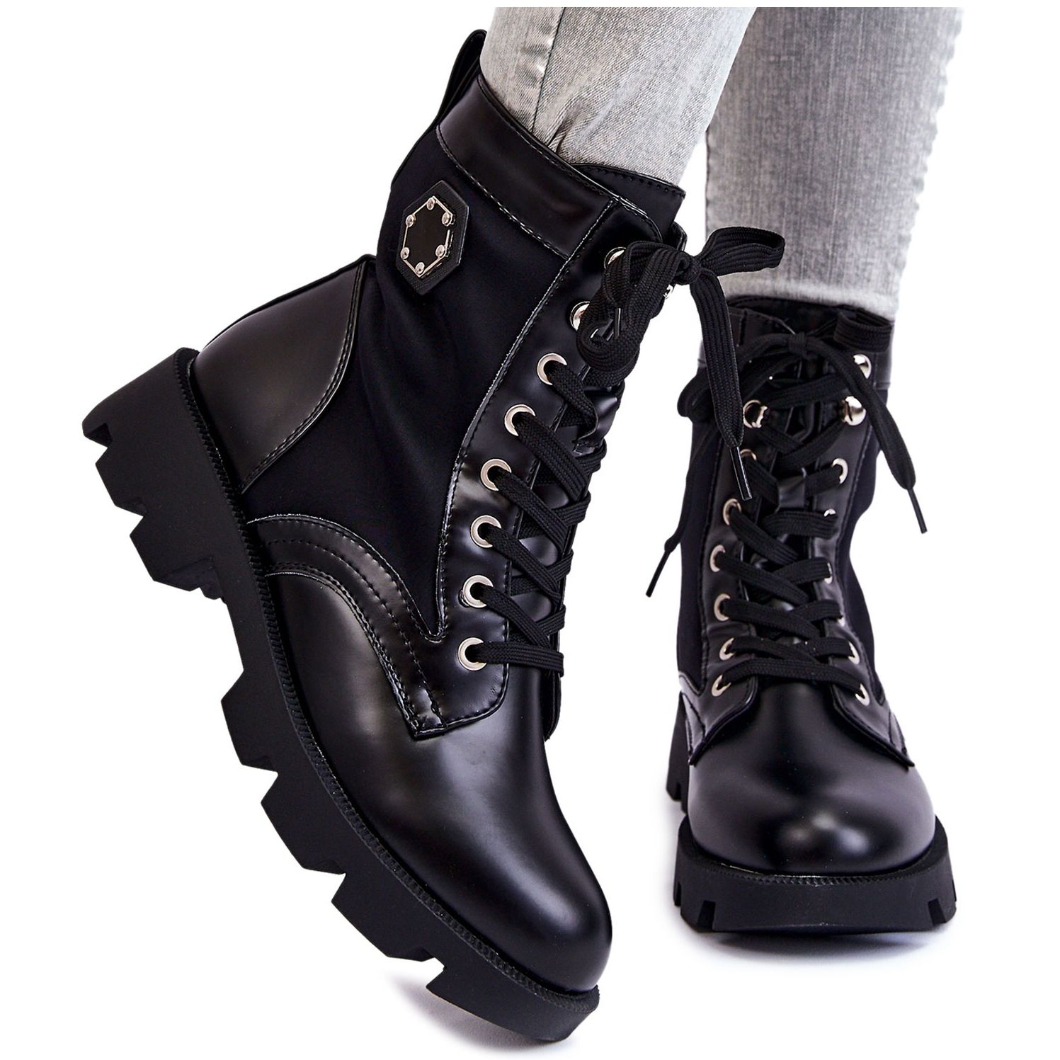 Ovdje je savršen spoj stila i udobnosti - ženske gležnjače PG1 na vezanje u elegantnoj crnoj boji. Ove moderne cipele savršen su izbor za žene koje cijene funkcionalnost i estetiku. Čizme su pažljivo izrađene od kombinacije eko kože i tekstilnog materijala, što jamči njihovu izdržljivost i udobnost nošenja.
