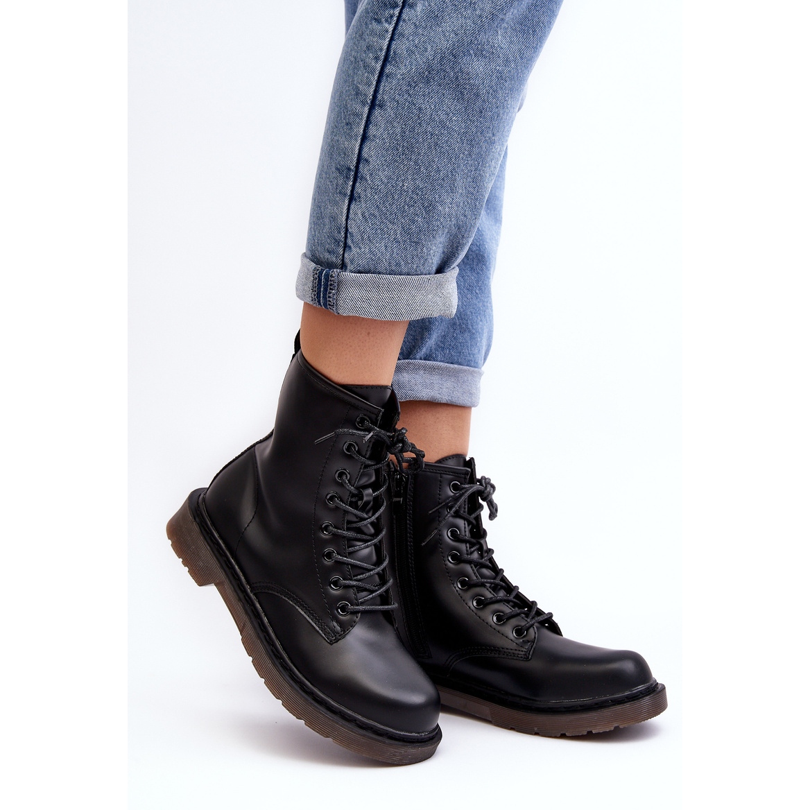 Klasične, bezvremenske planinarske čizme koje će raditi u svakodnevnim stilizacijama za jesen/zimsku sezonu. Izrađena od eko kože, ugrađene u ravnu petu s gumenim potplatom bez klizanja - kombiniraju udobnost sa sirovim, modnim karakterom. Model proglašen dodatnom bravom za jednostavnu pretpostavku. Zaobljeni nos, ukočen za bolju stabilizaciju stopala. Nema izolacije - savršena za hladnije, ali ne i mračne dane.