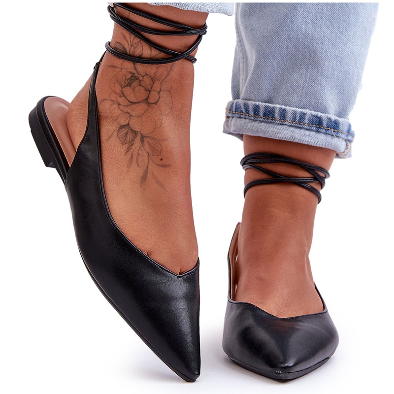 Ženske crne balerine su stilske, crne ženske balerine s otvorenom petom i nosom u Spitzu. Izrađene su od ekološke kože. Jedinstvenost ovih balerina naglašava vezivanje oko teleta. Ekološka kožna umetak pruža udobnost u nošenju, te ravna peta i stabilnost jamstva za potplat. Balerine su odličan model za toplije dane. Balerine teže samo 420 grama, što ih čini laganim i jednostavnim za nošenje.