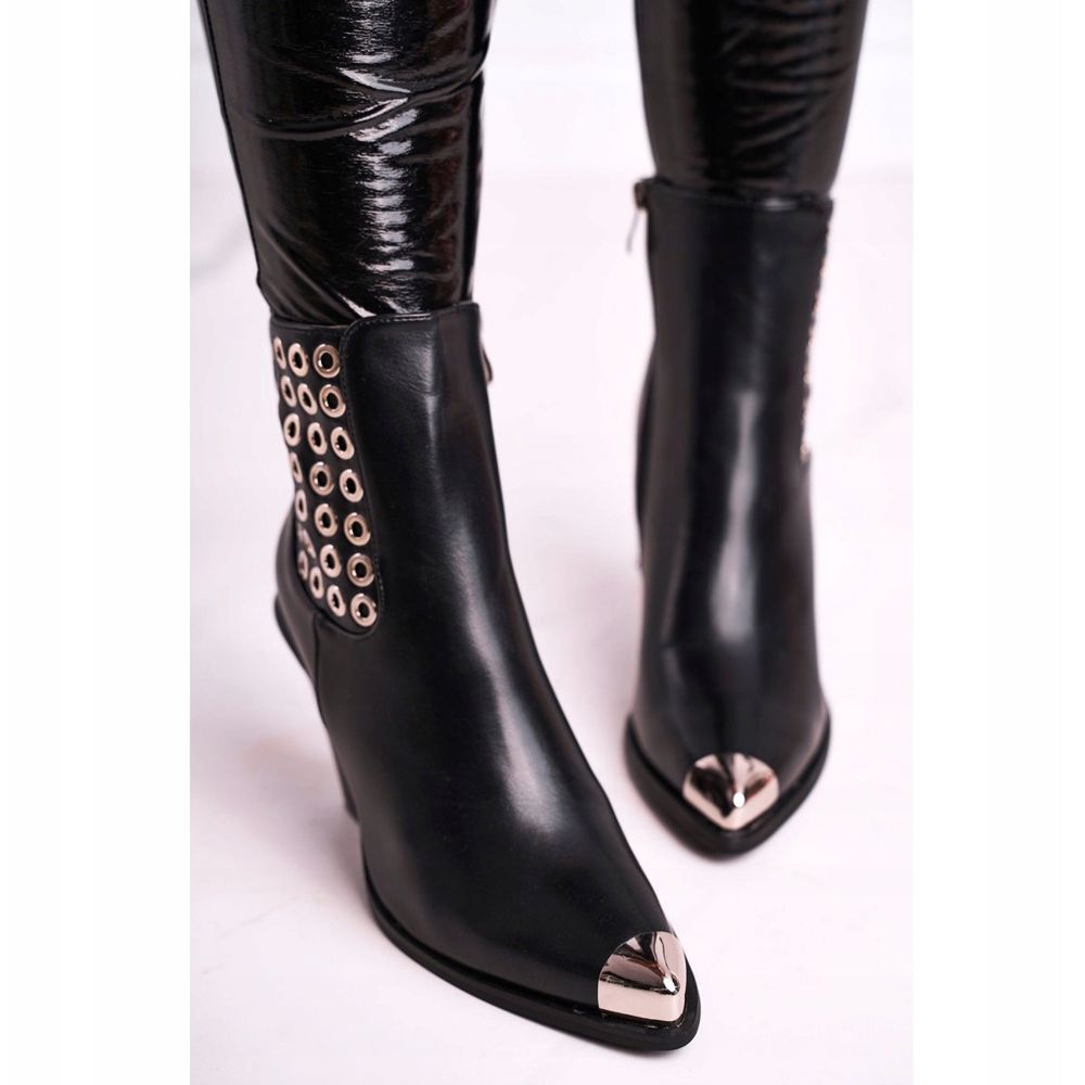 Ženske visoke čelične čizme Black Only Time idealan su prijedlog za žene koje cijene moderan i jedinstven stil. Ove iznimno elegantne cipele odlikuje se čeličnim vrhom koji im daje karakter i originalnost. Ukrasi u obliku srebrnih ušica sa strane gornjeg dijela privlače pozornost i čine da se čizme lako uklope u najnovije modne trendove.