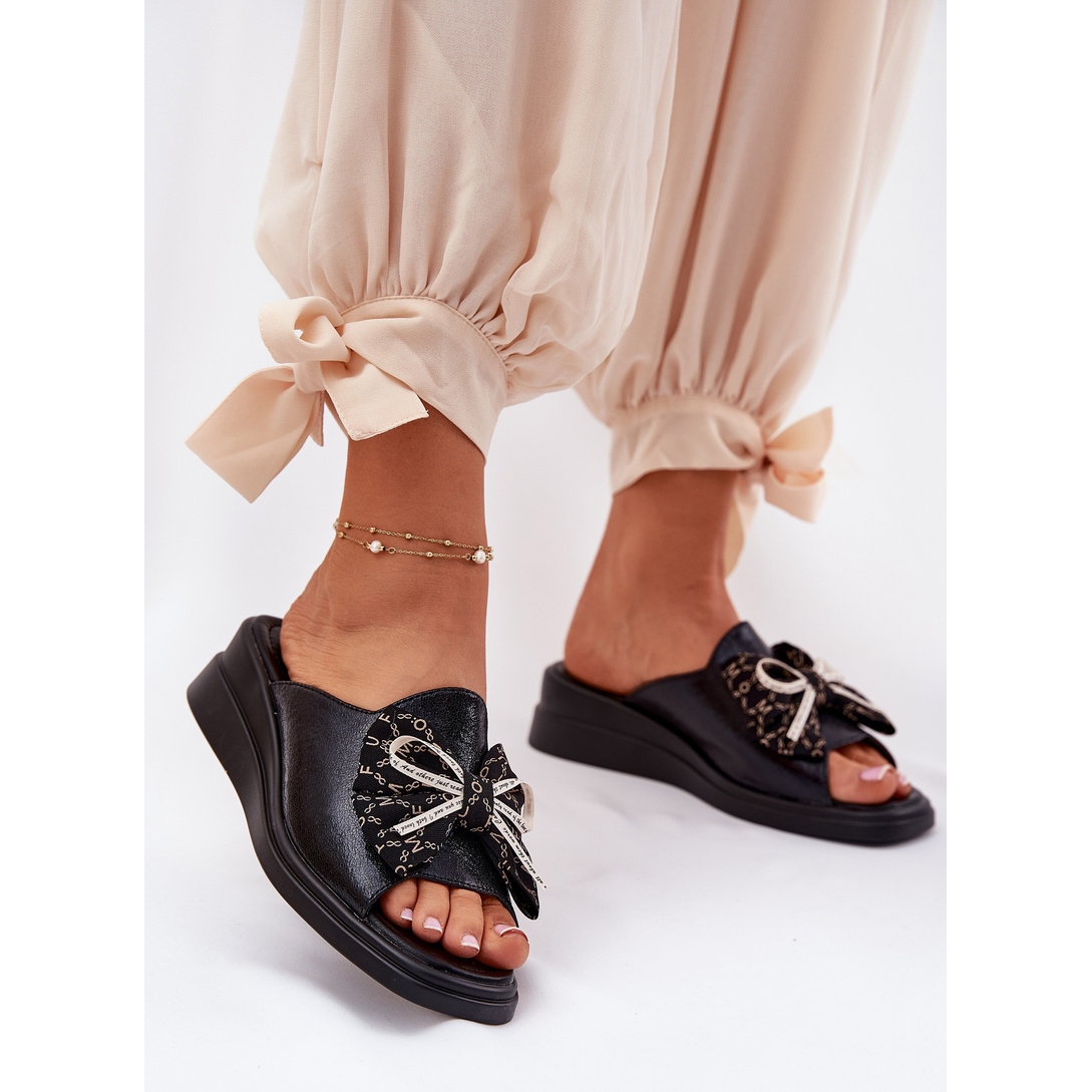 Model ugrađen u stabilni klin s visinom od 5 cm jamči udobnost nošenja cijeli dan, a dizajn s lukom daje im suptilan šarm koji upada u oko. Papuče su dostupne u klasičnoj crnoj boji, što ih savršeno miješa s raznim ljetnim odijelima.