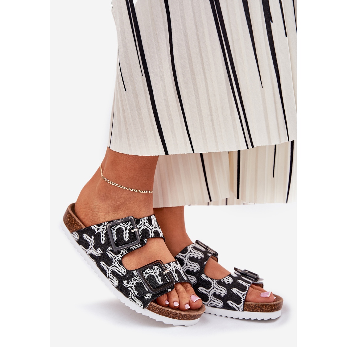 Evo ženskih papuča S. Barski RB51-006 u crnoj boji, koje kombiniraju udobnost, stil i moderan dizajn. Napravljeni od tekstilnog materijala, ističu se iz drugih modela zahvaljujući dvije pruge s kopčama koje su ukrašene sjajnim, što im daje jedinstveni karakter. Zaklopke su postavljene na 3 cm visoke kćeri, što osigurava udobnost nošenja cijeli dan.