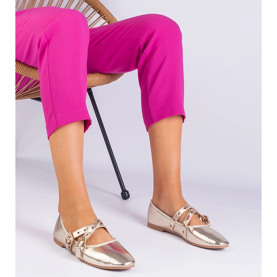 Zlatne balerine izrađene od eko -odlazača ukrašene kopčama zlatni