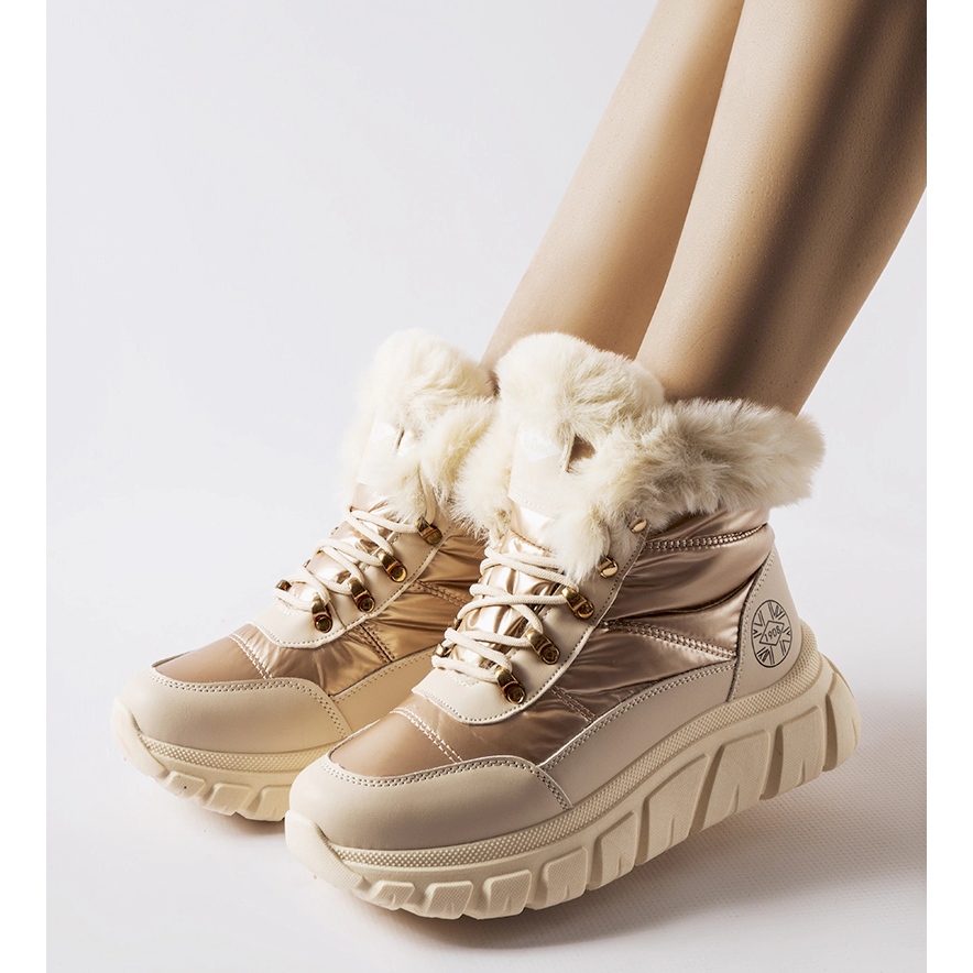 Visoka platforma, visoka 4 cm, omogućuje vam izolaciju stopala od hladne površine i istovremeno dodaje originalan karakter cipelama. Visina samih čizama za snijeg je 17 cm, što pruža odličnu zaštitu od hladnoće. Bez uzorka, ali jedinstvene zlatne boje, cipele će biti savršena potpora u sivoj zimi.