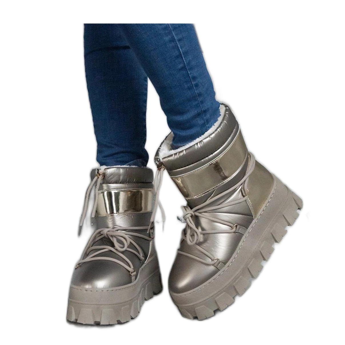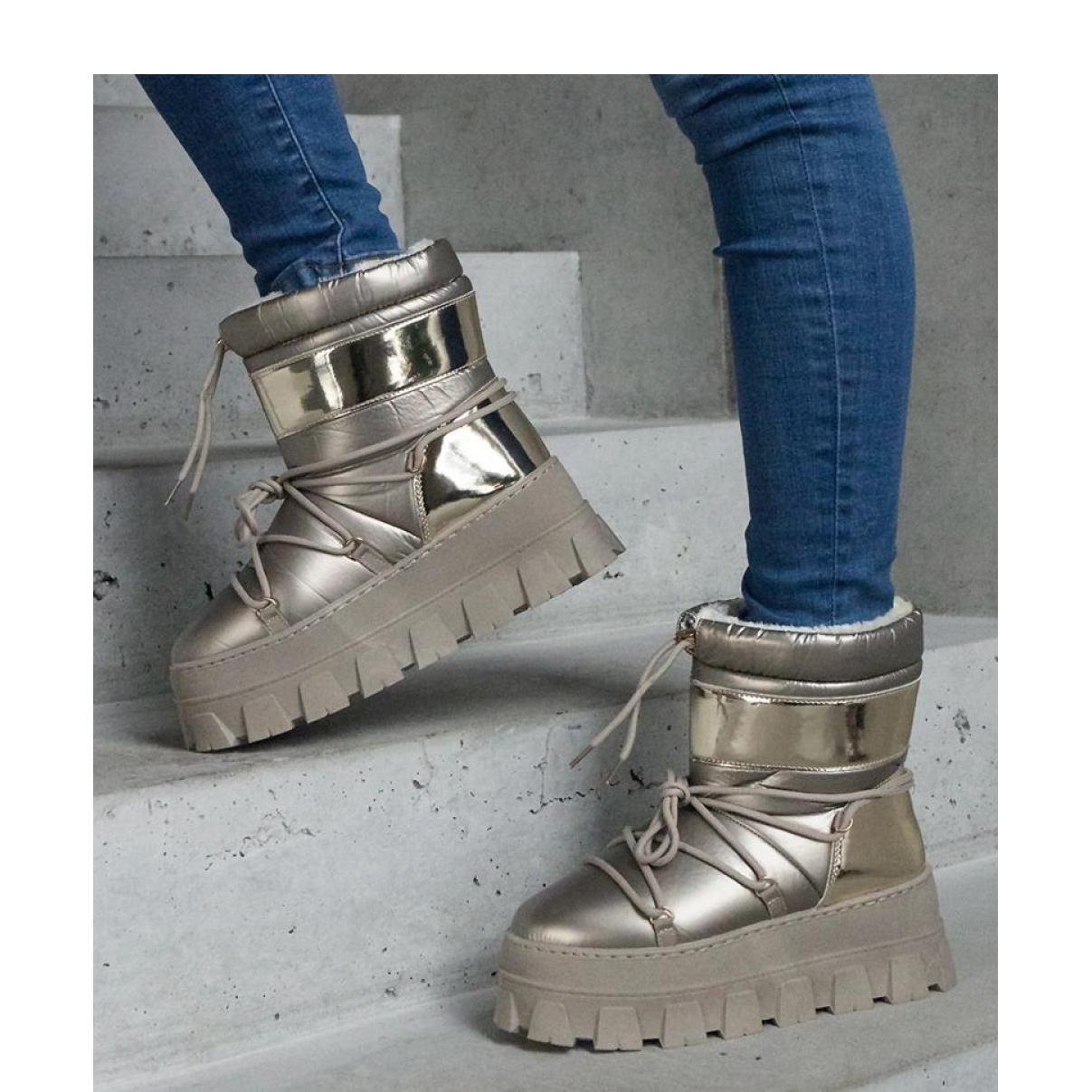 Zlatne snježne čizme na platformi s lakiranim izgubljenim umetcima proizvođača Solea obavezne su za svaku modnu ženu u nadolazećoj sezoni. Ove spektakularne cipele kombiniraju stil, udobnost i funkcionalnost, što ih čini savršen izbor za zimske dane.