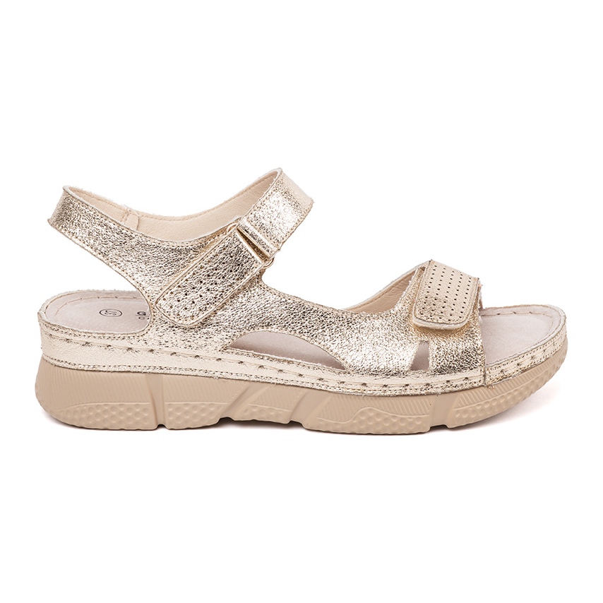 Sandale imaju otvorenu petu i nos, što osigurava izvrsnu prozračnost, a njihova ravna peta s visinom od 3,5 cm jamči utjehu tijekom dugih šetnji i ljetnih sastanaka. Umetak za prirodnu kožu osigurava mekoću u upotrebi, a čičak pričvršćivanje omogućava lako stavljanje i skidanje cipela.