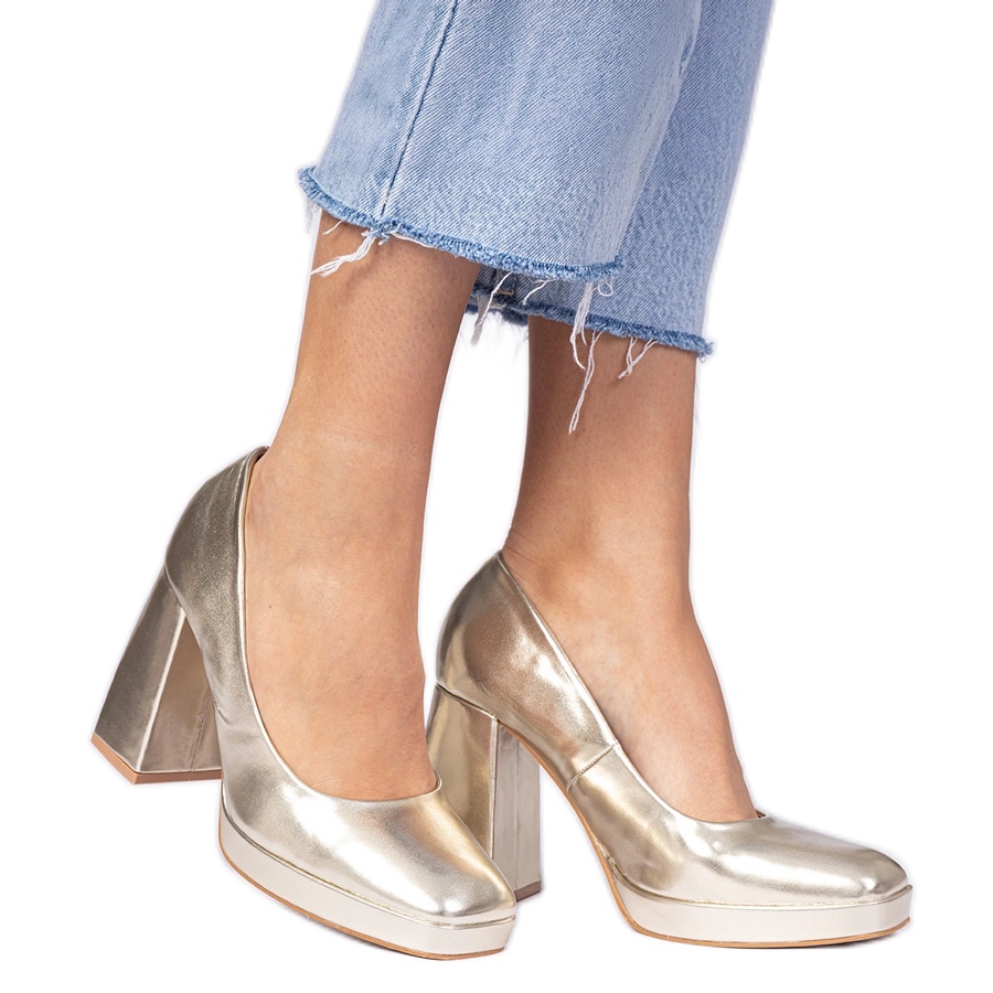 Detalji: Zlatne metalne pumpe na masivnom stanju s kvadratnim nožnim prstima zlatna