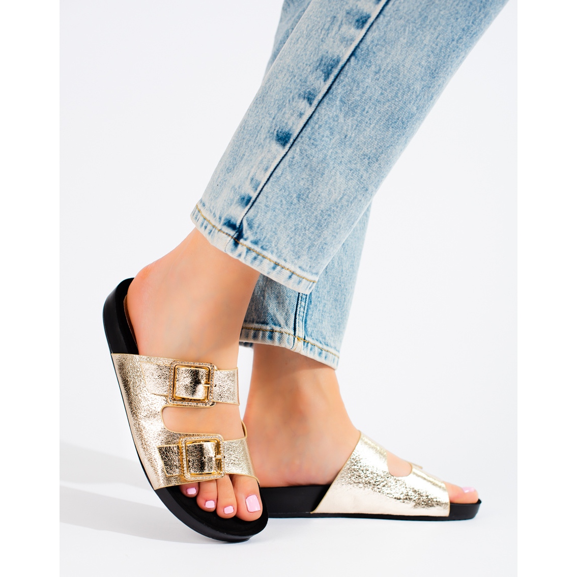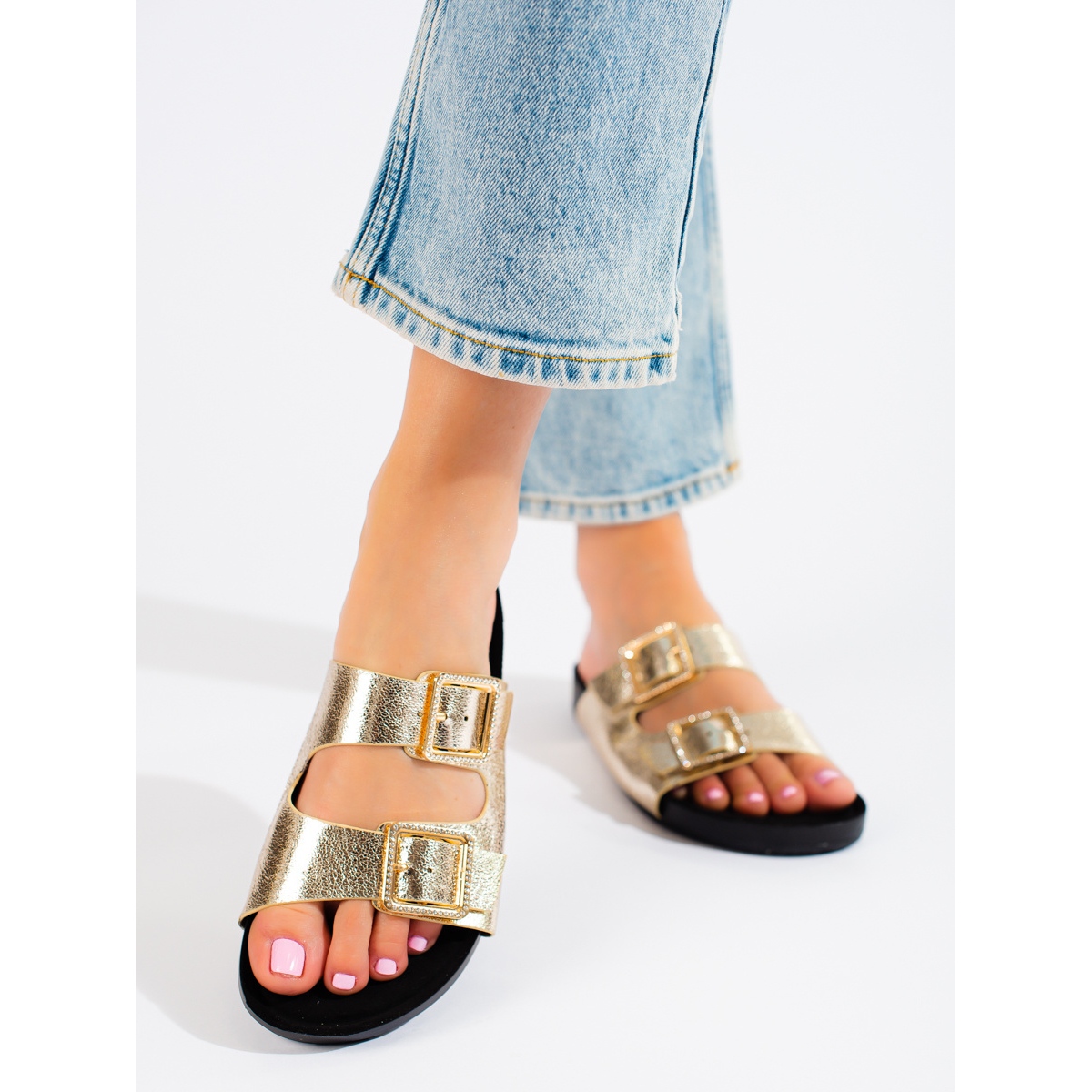Otkrijte eleganciju i udobnost nošenja Goodin zlatnih japanki s ukrasnim kopčama. Ove moderne ženske cipele, savršene za svakodnevnu upotrebu, spajaju klasičan dizajn s modernim detaljima, što ih čini savršenim za proljetni i ljetni styling.