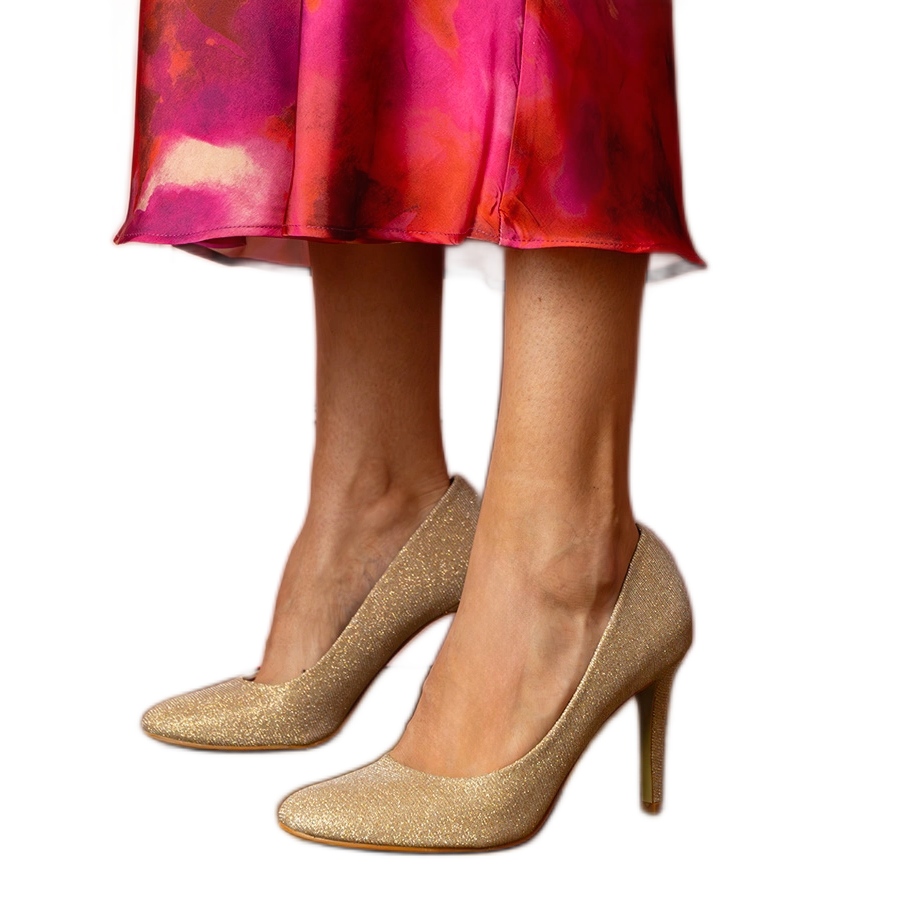 Zlatne pumpe na brodajskom završetku su kvintesencija elegancije i sjaja koji bi svaka žena trebala imati u svom ormaru. Ove zasljepljujuće cipele u zlatnoj nijansi, zahvaljujući suptilnom bademu NOSC -a, idealne su i za večernje izlete i za svečane događaje na kojima želite zasjati.