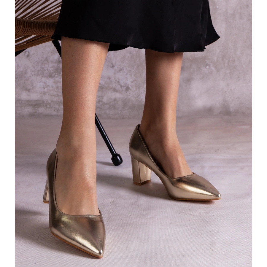 Visina pete od 7 cm čini ove pumpe elegantno naglašavaju lik, a čvrsta posta osigurava stabilnost na svakom koraku. Zlatna boja pojačava svaku stilizaciju, a umetnuta kopča olakšava stavljanje i skidanje cipela. Izrađena od visokokvalitetne ekološke kože, i vanjskog sloja i udobnog umetka, osiguravaju udobnost cijeli dan.