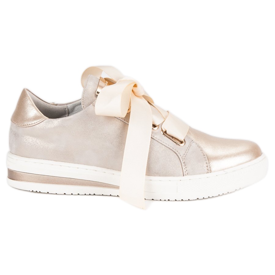 Izrađene od visokokvalitetne ekološke kože, cipele oduševljavaju svojom nježnom zlatnom bojom koja daje sjaj i ističe se u masi. Široke bež vrpce djeluju kao vezice, stvarajući neobičan, ali vrlo elegantan detalj. Dodatno, njihova peta je ukrućena, što daje izvrsnu potporu stopalu, a okrugli vrh naglašava klasičan karakter obuće.