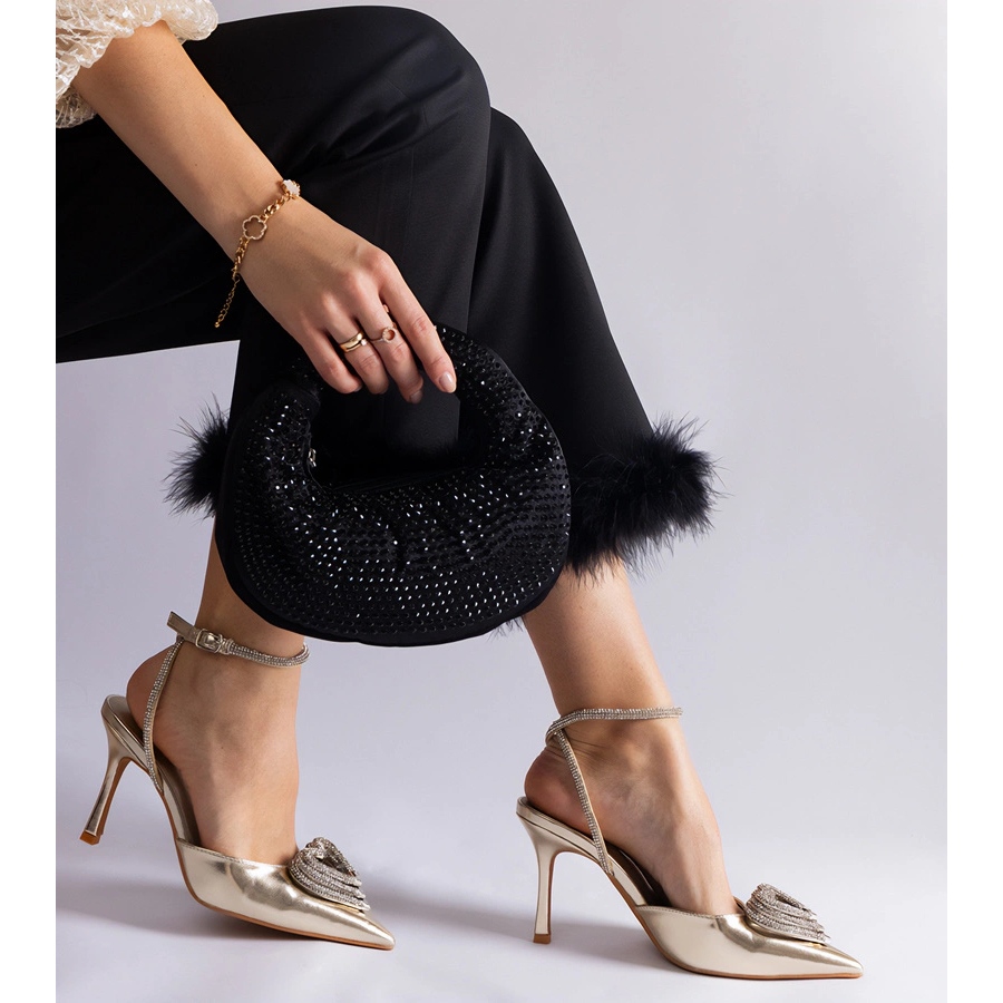 Zlatne visoke pete s otvorenom petom ukrašene cirkonima zlatni