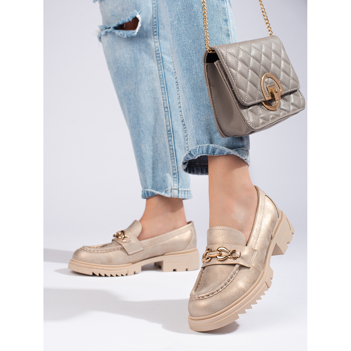 Profilirane zlatne mokasine privlače pažnju i daju šarm svakom stajlingu. Izrađene su od visokokvalitetne ekološke kože, što ih čini ekološki prihvatljivima i pristupačnima u usporedbi s alternativama od prirodne kože. Ipak, pozornost na udobnost korisnika vidljiva je u mekanoj, prirodnoj koži uloška, koja stopalima osigurava odgovarajuću prozračnost i udobnost i nakon dugotrajnog korištenja.